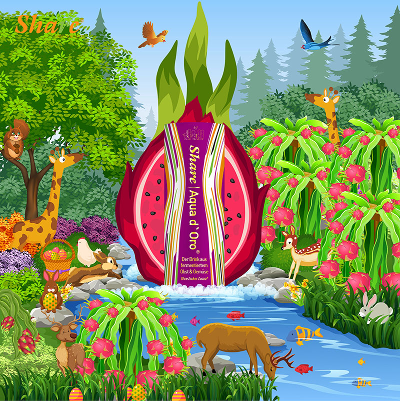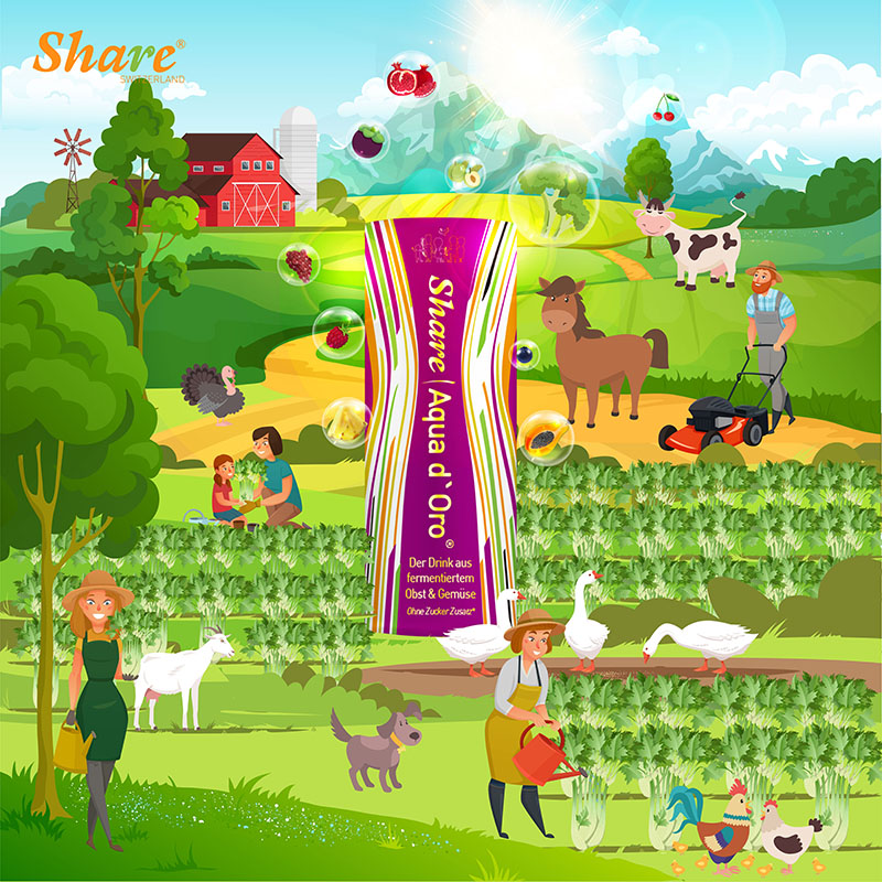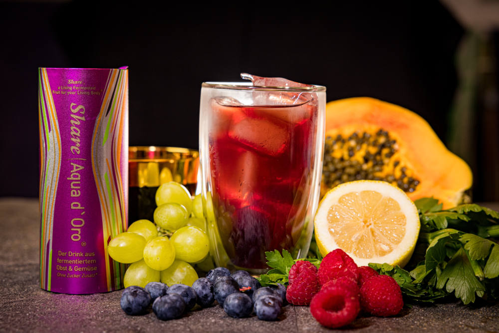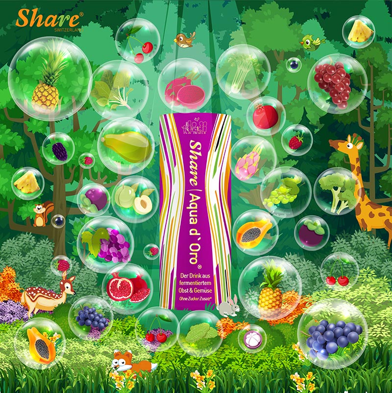 精心发酵的果汁组成:蓝莓,山竹,石榴,青梅,覆盆子,火龙果,番木瓜,菠萝,芦荟,阿萨伊果,芹菜,桑葚,蔓越莓,枸杞,干草粉,针叶樱桃果、奇亚籽,日本杏、西兰花、枸杞、石榴、番石榴、姜黄、山竹、木瓜等仅举最重要。我们不遗余力地仔细收集东西方世界、地球北半球和南半球最有价值的水果、草药、种子和提取物。但是,如果我们没有通过发酵使这些物质变得更有价值、更容易忍受、甚至更明显,我们就不会成为 SHARE®。凭借我们现有的两种 SHARE® 零食的丰富经验,我们创造了一种神奇的更容易被吸收分解的水分子,展开细胞层面的毒素分